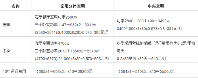 從總用電量來講,一臺中央空調其機器用電量小于每個房間裝一臺分體空調的用電量之和。以三室兩廳面積130㎡的戶型為例,按夏季運行4個月,冬季運行2個月,運行費用按每天8小時每月30天計算,估算電費如下(所有房間都開啟空調):